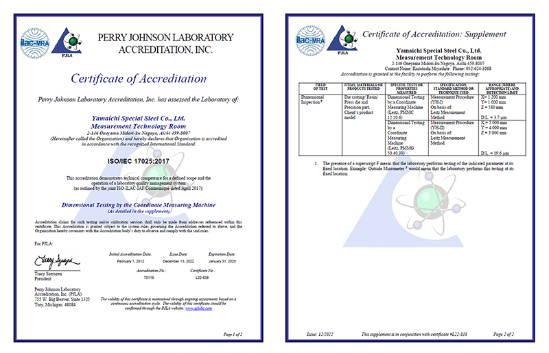 山一ハガネでは、高精度な測定機と恒温環境を整えたうえで、寸法証明書を提供している。