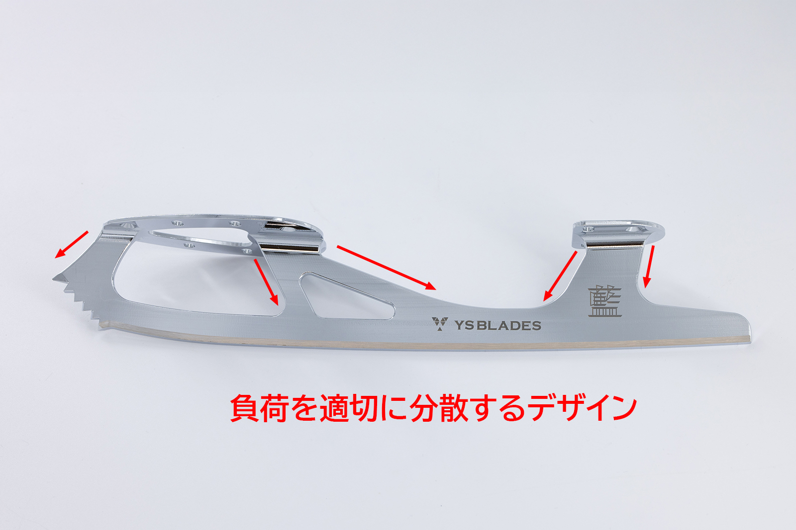 YS BLADESは、世界で唯一の“削り出し”による一体構造を採用し、他に類を見ない強度を実現しているが、さらにブレードの長さや支点の位置を工夫することで、ジャンプ時にかかる荷重が一点に集中しにくい設計をしている。